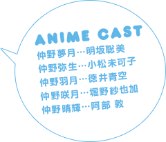 STAFF 監督        :木村 寛 キャラクターデザイン:伊藤 依織子 音響監督      :大室 正勝 制作プロダクション :ドリームクリエイション アニメーション制作 :Creators in Pack 音響製作      :ダックスプロダクション CAST 仲野 夢月 明坂 聡美 仲野 弥生 小松 未可子 仲野 羽月 徳井 青空 仲野 咲月 堀野 紗也加 仲野 晴輝 阿部 敦